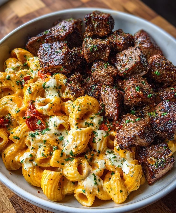 Indulge in juicy steak bites served with creamy, cheesy rigatoni—an irresistible combo that takes comfort food to the next level.